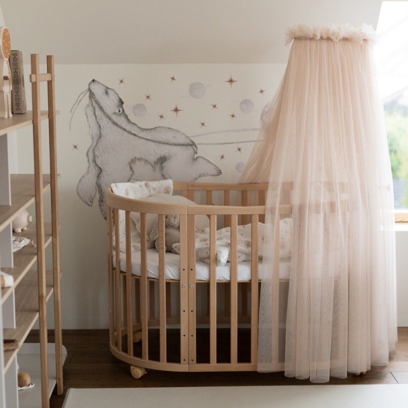 Suporte -dossel -mosquiteiro é ajustável, fixado no berço de bebé e colocado depende das necessidades do cliente. O dossel pode proteger a criança contra a luz e o sol . É também um elemento decorativo no quarto das crianças.