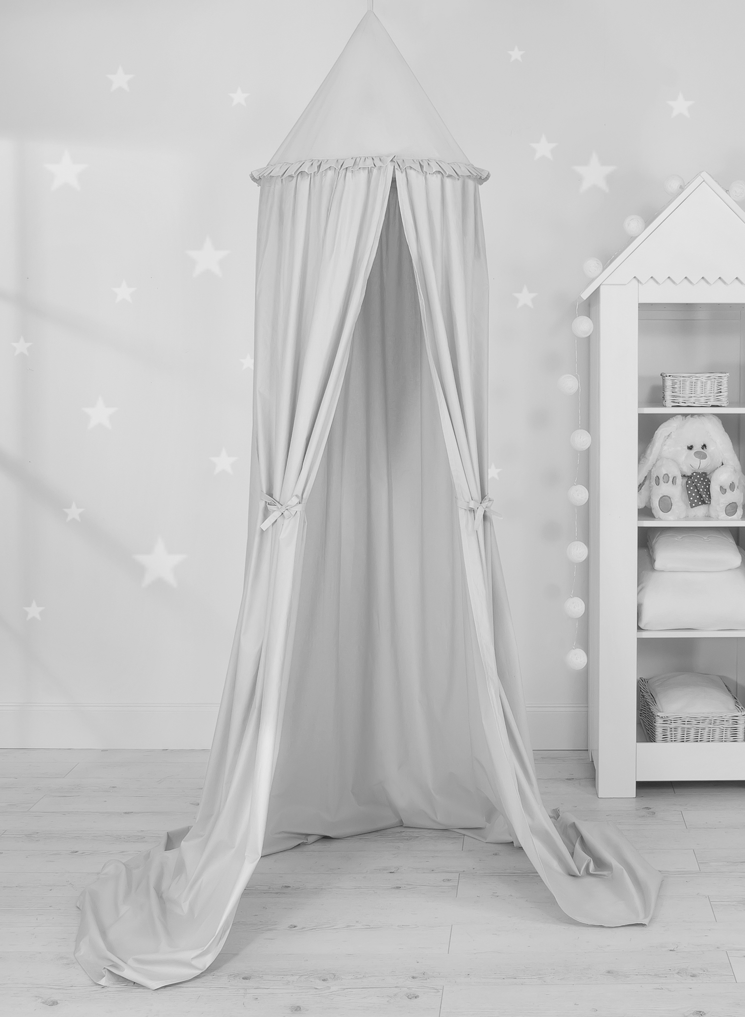 Um dossel longo e eficaz. Um elemento bonito no quarto das crianças. Pode ser usado como uma decoração única para um berço de bebé, assim como pode criar um lugar maravilhoso para brincar. Pendurado sobre o berço, protege o dossel contra muita luz e barulho, criando um lugar aconchegante e seguro para descansar dentro do berço. O dossel pode ser facilmente montado no teto. O comprimento de 260 cm permite organizar as pontas no chão. O dossel é feito de tecido 100% algodão certificado pela Okotex. Nas laterais há fitas práticas para amarrar o dossel e criar uma linda barraca. A borda na parte superior pode ser removida. O tecido é lavável a 30 graus.