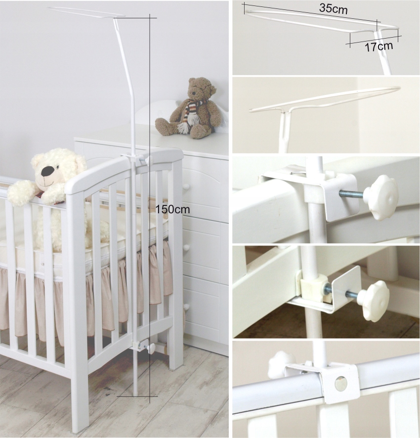 Suporte -dossel -mosquiteiro é ajustável, fixado no berço de bebé e colocado depende das necessidades do cliente. O dossel pode proteger a criança contra a luz e o sol . É também um elemento decorativo no quarto das crianças